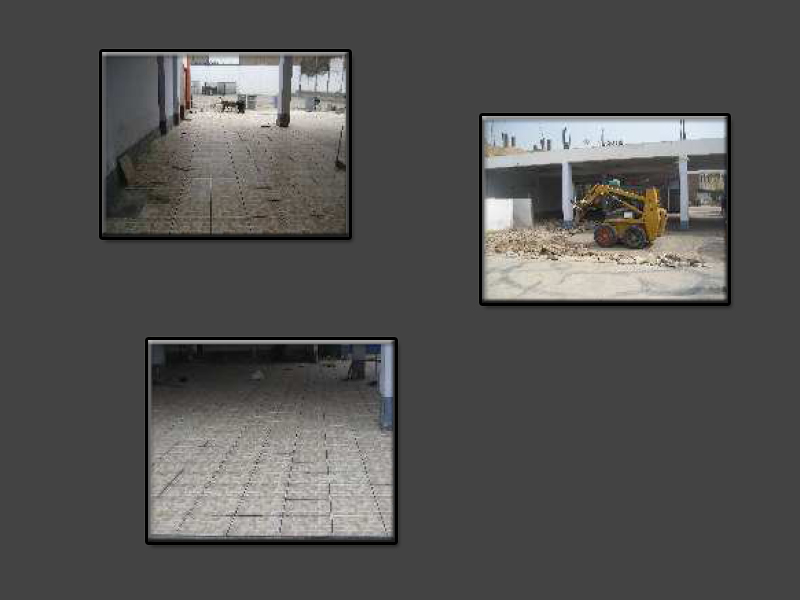 Demolición y eliminación de losa de concreto existente. Vaciado de falso piso de concreto e=10cm en un área de 560m2. Revestimiento de piso cerámico de 40x40cm.